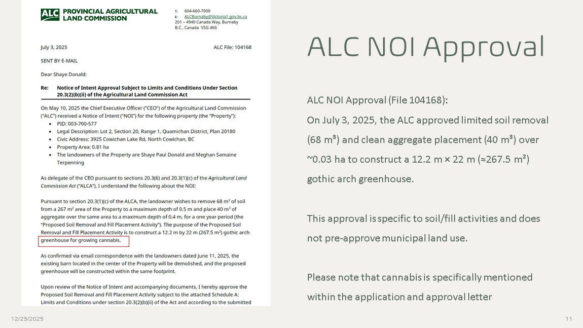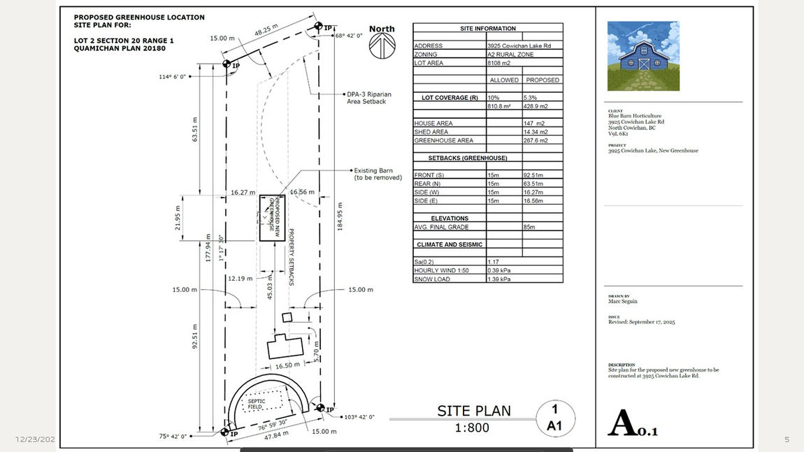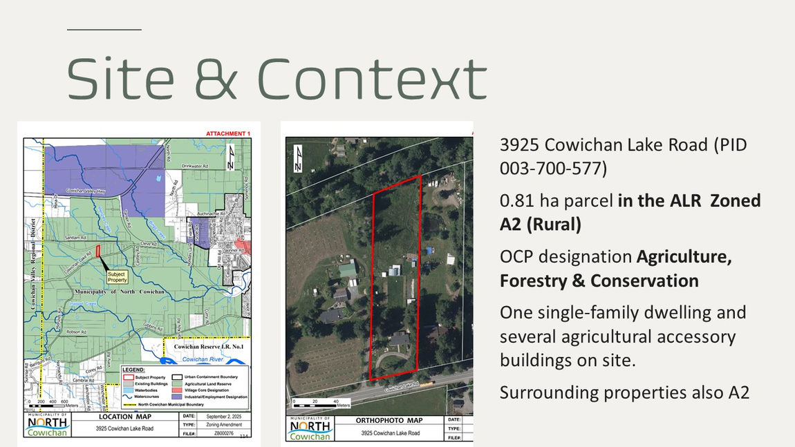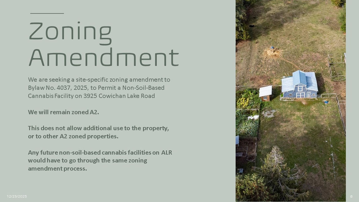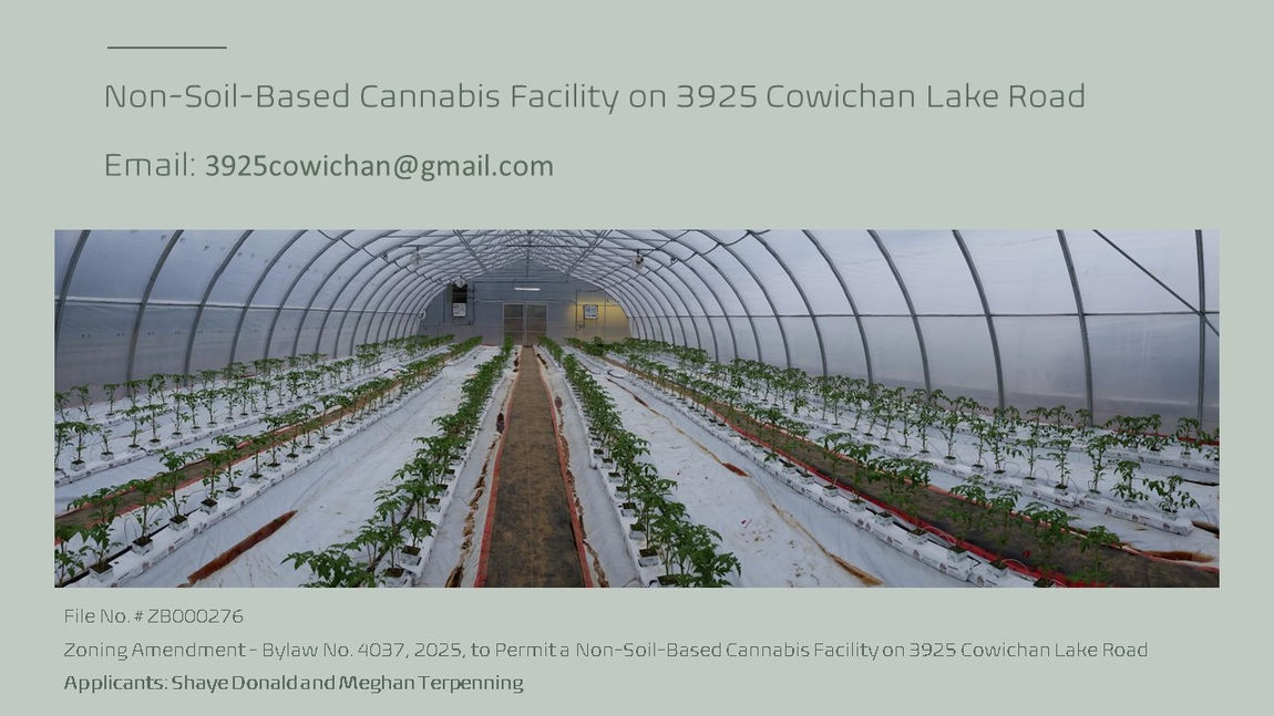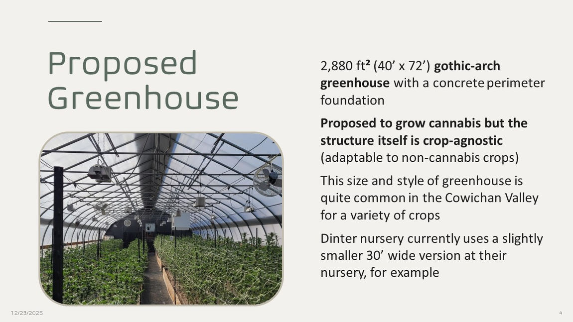 We’re applying for a site-specific zoning amendment to allow a small, purpose-built non-soil-based greenhouse on our ALR property at 3925 Cowichan Lake Road. The greenhouse we’re proposing is approximately 40’× 72’ (2880 ft2), sized to fit responsibly within the usable area of our property while keeping the overall footprint modest.